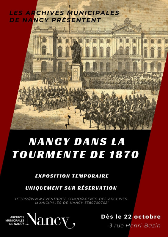 Dans le cadre de la commémoration du 150e anniversaire de la fin de la guerre de 1870-1871, les Archives municipales de Nancy vous proposent l’exposition « Nancy dans la tourmente de 1870 ». Celle-ci sera présentée dans la nouvelle salle pédagogique des Archives municipales.